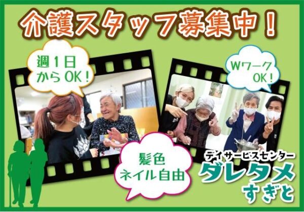デイサービスセンター ダレタメ すぎと【介護スタッフ アルバイト/パート】髪色・ネイル等自由!あなたの個性大切にします。当社独自の手当も充実!